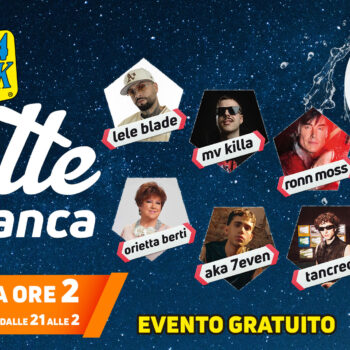Sabato 9 agosto, dalle 21:00 fino alle 2:00 (chiusura straordinaria) Sul palco con noi: – Orietta Berti – Sarah Toscano – Aka 7even – Ron Moss – Lele Blade – MV Killa – Tancredi – Chiamimifaro E tanti altri ancora! E in galleria… artisti di strada e spettacoli itineranti! Extra promo dalle 21:00 alle 2:00…